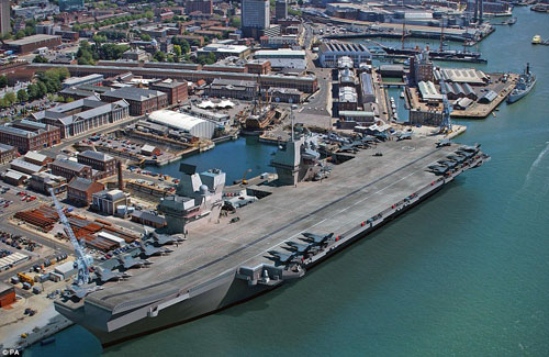 這張由電腦模擬的圖片旨在使人們大體了解2015年將“服役”的新一代戰艦的外型。圖片顯示,該航母停泊在英國樸次茅斯海軍基地,長度超過3個碼頭的長度。如果建造成功,將成為“英國設計和建造的有史以來體型最大的、功能最強大的軍艦”。預計這艘航母寬70米,飛行甲板面積足有49個網球場或3個足球場那么大,能同時搭載40架飛機。