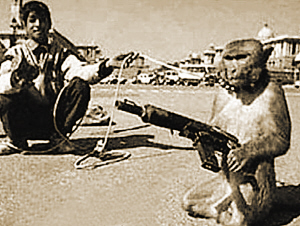 據英國媒體27日報道,阿富汗的塔利班軍閥們竟想出了一種匪夷所思的方法來對付駐阿盟軍:他們竟將一些愛吃香蕉和花生的猴子訓練成了“致命殺手”,教會了這些猴子如何使用卡拉什尼科夫沖鋒槍、布倫式輕機槍甚至迫擊炮,并教它們如何專門向穿美軍服裝的士兵發起襲擊。頗具諷刺意味的是,“訓練猴子當殺手”的主意最早卻是由美國中情局發明出來的,美國中情局曾在越戰中發起“香蕉行動”,專門用花生和香蕉當獎品,訓練一些“猴子士兵”在叢林中獵殺越南士兵。