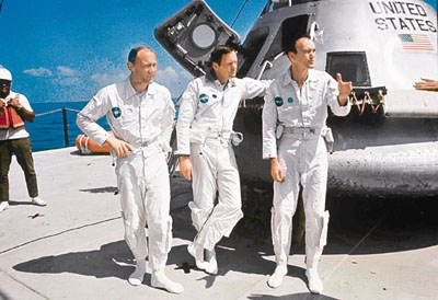 據(jù)香港《文匯報》報道,1969年7月,3名宇航員阿姆斯特朗、科林斯和奧爾德林,擠在“阿波羅11號”里展開他們歷史性的8天旅程。此次紀念登月40周年,周日3人終于有機會再一同出現(xiàn)在公眾面前,并在華盛頓的史密森學會國家航空航天博物館發(fā)表演講,一起談?wù)撎諝v史。這或許將是3位年屆8旬的老人,最后一次集體亮相。
