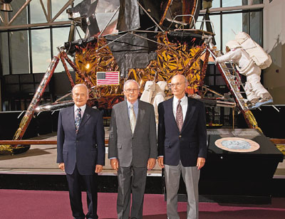 相隔40年,奧爾德林、阿姆斯特朗和柯林斯(左起)在太空博物館登月模型前合照。