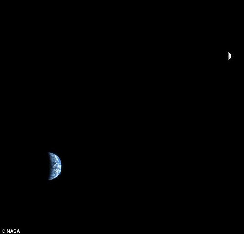 這張由美國太空總署(NASA)運行火星的軌道探測器拍得的照片,是在繞行火星軌道時拍攝的,在一片漆黑無垠的宇宙中,地球和月球都呈現月牙狀。