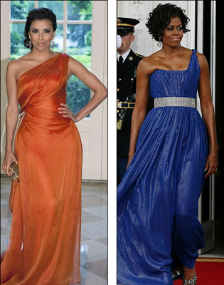 中新網5月20日電 據外媒報道,美國白宮19日舉辦國宴,款待墨西哥總統卡爾德龍夫婦。此間美國第一夫人的穿衣打扮再被媒體拿出來品頭論足。不幸的是,這次米歇爾•奧巴馬竟然與“絕望主婦”伊娃•朗格利亞大撞衫,頗為尷尬!