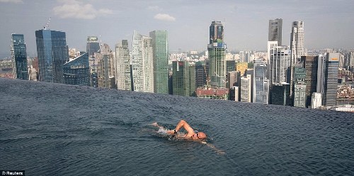 報道稱,建在樓頂的泳池看起來如同水面延伸到地平線一般壯觀。你可以一邊游泳,一邊俯瞰新加坡靚麗的城市風光。從泳池溢出的水會滲入到特別設計的集水區,并通過水泵和水處理系統重新回到泳池中。