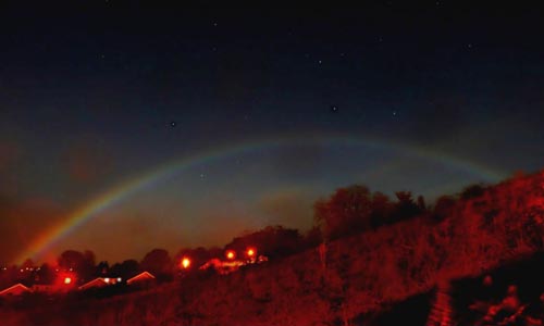 據報道,彩虹出現在英國北約克郡Richmond鄉村地區,通常彩虹是雨滴折射陽光形成的景象,而此次彩虹出現時太陽已經下山很久了,不過當天有一輪圓月,為人們帶來了奇特的夜間彩虹。