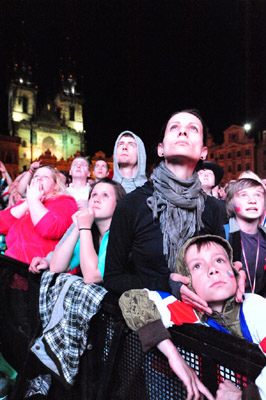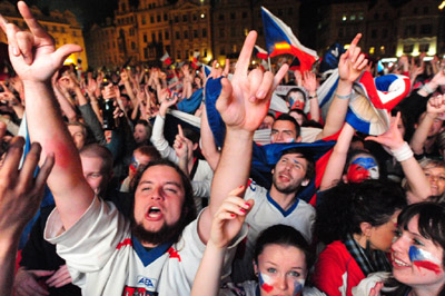 數千名球迷23日晚上聚集在布拉格市中心老城廣場觀看球賽的電視實況轉播,捷克隊最終取勝后人們一片歡騰。(黃頻)