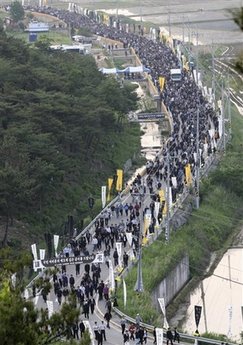 從24日上午至27日下午4時,在四天時間里共有38萬多名吊客在這里就餐。主要由附近村莊的婦女會員和義勇消防隊隊員組成的300多人的志愿團從上午11時到晚10時準備出供10萬多人食用的飯(以27日為準),分發(fā)給市民。晚10時以后提供面包和牛奶、碗面。據悉,在29日舉行盧武鉉遺體告別儀式后,葬禮委員會和金海市政府等將分擔食品費用。