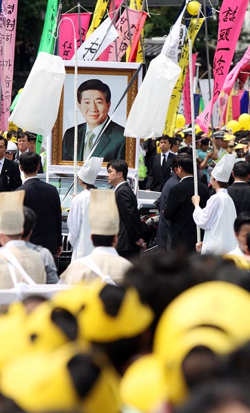 在景福宮遺體告別儀式結(jié)束后于中午12時(shí)30分出發(fā)的盧武鉉的靈車,經(jīng)由東十字閣、世宗路和太平路,于下午1時(shí)20分抵達(dá)首爾廣場(chǎng)。