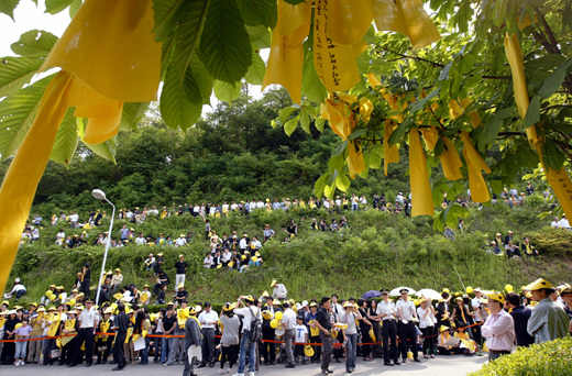 下午6時15分(北京時間下午5時15分),盧武鉉的遺體抵達棺柩臺時,周圍的市民們紛紛高呼“永別了!”6時22分(北京時間下午5時22分), 盧武鉉的兒子盧建昊代表遺屬在室外焚香所向故人焚香,最后拜別父親,并敬了一杯酒。權良淑女士焚完香后,暫時踉蹌了一下,此時,現場吊客都喊叫“盧武鉉”的同時予以鼓掌,以給遺屬加油助威。