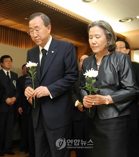 韓國時間18日晚,聯合國秘書長潘基文與夫人來到設在新村塞布蘭斯醫院的金大中的靈堂前,為其吊唁。(韓聯社)