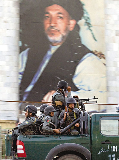 一隊武裝警察巡邏經過現任總統卡爾扎伊的選舉海報。