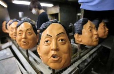 中新網9月5日電 在日本眾院大選中民主黨大勝后,模仿該黨代表鳩山由紀夫樣貌的橡膠面具正在吸引越來越多的人。與此相對,去年秋季剛發售時還算走俏的現任首相、自民黨總裁麻生太郎的面具則有些賣不動了。兩位黨首在大選中鮮明的勝負之別同樣反映在了面具的對決上。