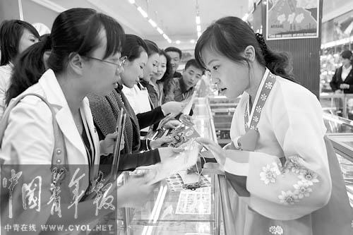 中國青年代表團成員在平壤友誼商店購物。本報記者 李建泉攝