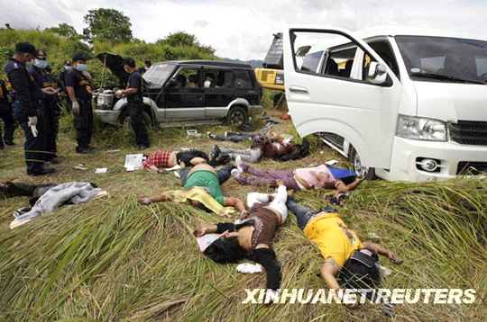 菲律賓南部棉蘭老島自治區(qū)內(nèi)的馬京達(dá)瑙省23日發(fā)生兇殘屠殺事件。一伙為數(shù)約100人的不明身份持槍者劫持了數(shù)十名當(dāng)?shù)卣缛耸亢陀浾摺?/p>
