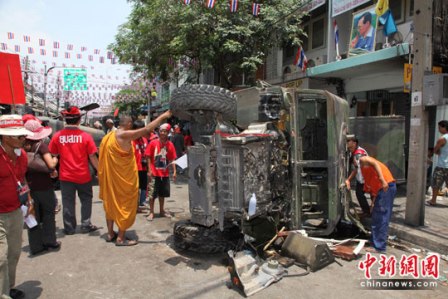 泰國10日晚的血腥沖突造成至少21人喪生,874人受傷。這是自從1992年有48人在一次反軍方抗議中被殺以來,曼谷最嚴重的暴力行為。傳媒透露,下令驅散“紅衫軍”的是陸軍第二把交椅、陸軍副司令帕拉育,他還表示會承擔一切后果。暴力沖突后,軍隊撤后以示節制,并且要求“紅衫軍”也后退,因此11日深夜,曼谷出現一種非正式的停火狀態。