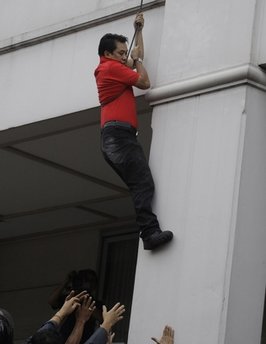 紅衫軍領(lǐng)導(dǎo)人阿里斯曼(Arisman Pongruanrong)通過繩梯從位于曼谷市中心的這家酒店爬下,在等候的紅衫軍民眾的幫助下,進入一輛車中然后迅速離開。另外一名紅衫軍領(lǐng)導(dǎo)人從酒店窗戶爬出并順著一棵樹滑下,也成功逃離現(xiàn)場。