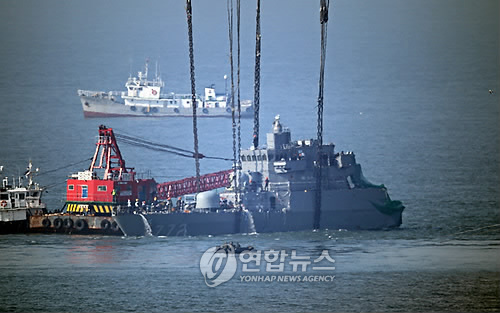 中新網(wǎng)4月24日電 據(jù)韓聯(lián)社報(bào)道,韓國(guó)海軍“天安艦”艦首24日被吊出水面之后,呈現(xiàn)了沉沒(méi)之前受到強(qiáng)力沖擊的痕跡。