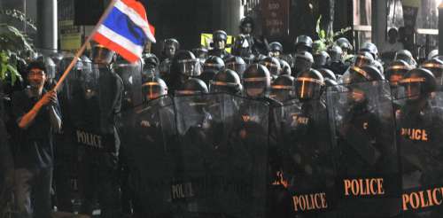 紅衫軍昨日繼續示威,領袖納塔兀表示,他們將繼續以非暴力方法抗爭,但其他領袖向集會示威者發言時,揚言發動“游擊戰”對抗,又威脅“攻入”大型商場。另一領袖乍都蓬說:“這里已濺出第一滴血,整個國家將成血浴之地。”