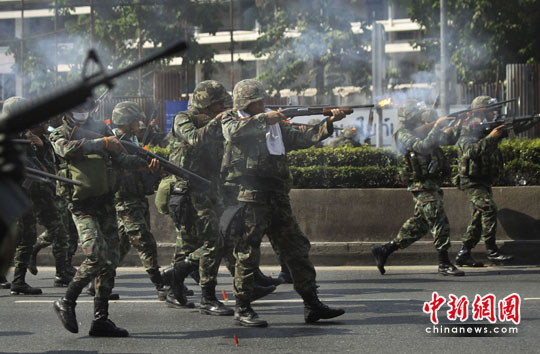 美聯(lián)社在報(bào)道中表示,泰國(guó)軍隊(duì)向示威人群開槍、發(fā)射催淚彈,并向紅衫軍集會(huì)地點(diǎn)推進(jìn)。