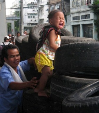 媒體稱一名男童被紅衫軍示威者舉在輪胎路障前,他的頭部清楚地暴露在泰國士兵的槍口下。