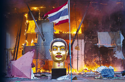 中新網5月20日電 據香港《文匯報》報道,泰國軍方19日清場,希望將陷入內戰邊緣的曼谷拯救出來,雖然紅衫軍節節敗退,但有激進分子未肯罷休,四處放火,電視臺、股票交易所、電力公司、幾間銀行、商場戲院都遭殃,商場和便利店亦成為搶掠目標。據報曼谷有27處地方起火,泰國最大的商場Central World、Siam Square和Siam Paragon三大購物中心被縱火,其中Central World燒通頂,據報快將倒塌。