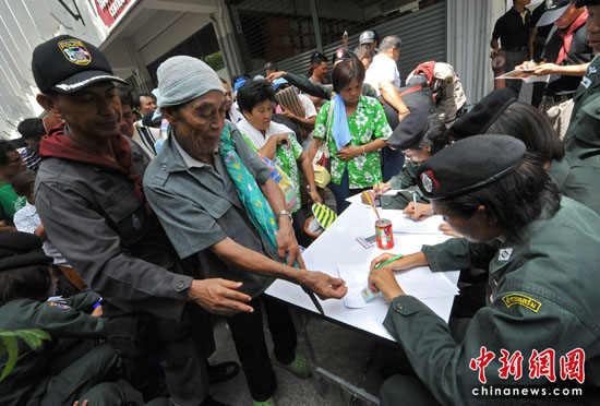 在警察總署等待回家的抗議者身邊都放著自己的家當(dāng),有些人神情沮喪,但仍有不少人仍然保持泰國(guó)人的輕松態(tài)度,在等待時(shí)談笑。離開的時(shí)候,一個(gè)婦人微笑著對(duì)記者揮手,男人們則神情肅穆地接受軍人檢查。