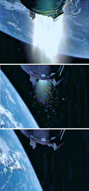 韓國方面公布的這三張照片,分別是兩段火箭的引擎正常點火發動的照片(上)、兩段火箭的燃素即將熄滅時的照片(中)和航天器因火箭上段未能正常分離的整流罩而偏離軌道的照片(下)。