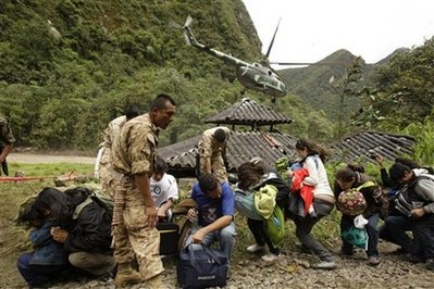 由于近日當(dāng)?shù)乇┯赀B連,河水暴漲引發(fā)洪水,鐵路被阻斷,2000多名乘客被圍困在馬丘比丘,被迫滯留數(shù)日。秘魯當(dāng)局派出直升機(jī)進(jìn)行援救,目前為止疏散了1400名乘客,還將對仍然滯留800名乘客進(jìn)行救助。