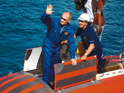 根據(jù)國(guó)營(yíng)電視臺(tái)發(fā)出的照片,可見身為柔道黑帶高手的普京身穿藍(lán)色工作服,攀上Mir-1潛艇開始航程。普京在船艙表示:“這次潛水很順利,視野在燈光下很好。”但他對(duì)水顯得污濁有微言:“從生態(tài)角度看這些水當(dāng)然干凈,但事實(shí)上這是浮游生物湯,起碼我是這樣叫它。”
