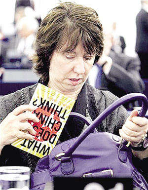 當(dāng)?shù)貢r(shí)間9日,歐盟女外長(zhǎng)阿什頓出席歐洲議會(huì),入場(chǎng)坐定后,就從包里掏出一本名為《中國(guó)怎么想》的書,這一瞬間剛好被美聯(lián)社記者的快門捕捉下來。