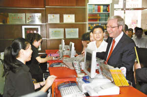 “澳大利亞總理喜歡有關中國傳統文化的圖書”,記者近日從北京發行集團獲悉,8月8日上午,前來北京參加第29屆奧運會開幕式的澳大利亞總理陸克文在澳大利亞駐華大使芮捷銳博士的陪同下走進王府井書店選購圖書。