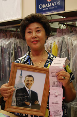 之前的30多年里,這家洗衣店是由另外一位韓國人經營,姜女士是在去年剛接手過來的。她表示:“聽之前的店主人說‘奧巴馬1992年和妻子米歇爾結婚后就成了我們店的常客’。即使在競選期間,他每周也送洗兩次衣服。”說著,她還展示了奧巴馬的照片和他開出的回執。