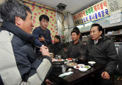 12月4日凌晨,韓國總統李明博來到首爾可樂洞農水產市場,慰問和鼓勵小商販們。