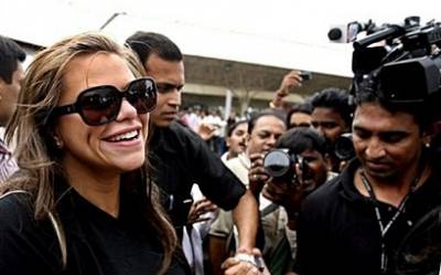 酒店門口,站滿了警察、媒體記者和熱心的祝愿者。一架直升機盤旋在上空,打出寫有新郎新娘名字的條幅。