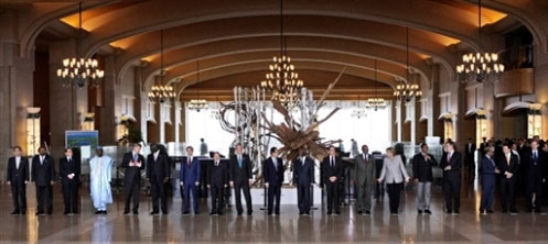 7月7日,出席八國集團(tuán)首腦與非洲國家領(lǐng)導(dǎo)人對話會議的有關(guān)國家領(lǐng)導(dǎo)人在一起。