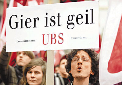 瑞士工會會員23日游行到瑞士銀行集團總部,要求銀行高層退還大額花紅。