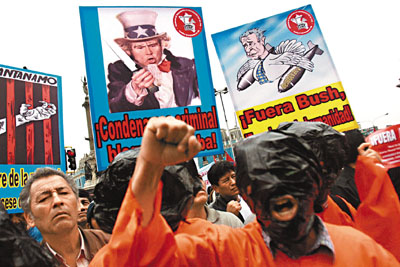 約1000人走上利馬市中心街頭示威,他們認為布什是全球經濟危機的始作俑者,大喊“布什滾蛋”。