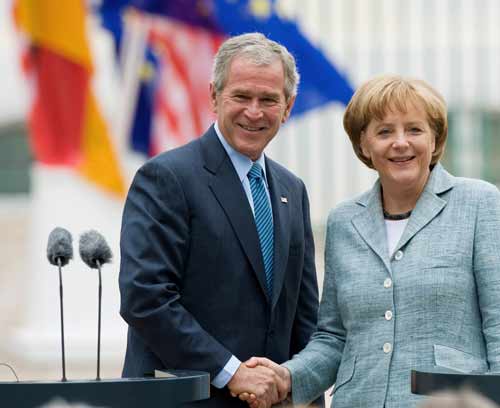 布什訪問(wèn)德國(guó),與德國(guó)總理默克爾女士共同舉行了記者招待會(huì)。