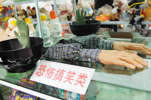 走進這家名為“搞笑玩具店”的大門,不小心觸到了懸掛在半空中的一件玩具,一陣“鬼叫聲”嚇了記者一跳,順著聲音望去,只見懸掛在半空中的是一個“玩具骷髏”,正順著繩索一邊怪叫著,一邊往上爬。這次驚嚇還沒緩過來,那邊一條斷臂又著實嚇人不輕,撕裂的衣服袖子里,一條慘白的手臂“躺”在柜臺里,好在旁邊的文字還能安慰一下受驚的心——恐怖搞笑類。原來,這邊柜臺里的玩具都帶著“恐怖”色彩。在旁邊的另一個柜臺上,分別設計成男女人體形狀的兩個玩具筆架引起了記者注意。只見這兩個筆架的筆插孔處分別設計在男子和女子的下身隱私處。