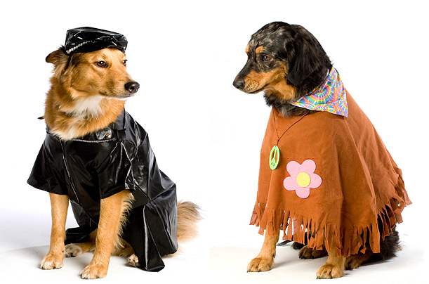 圖片五:在左邊圖片中,小母狗蘇菲穿上雨衣皮裝,欲表現(xiàn)嬉皮士的不羈風(fēng)格;右邊圖片中,小公狗丹特卻披上圍巾,裝出一副溫順休閑的模樣。(鐘巖)