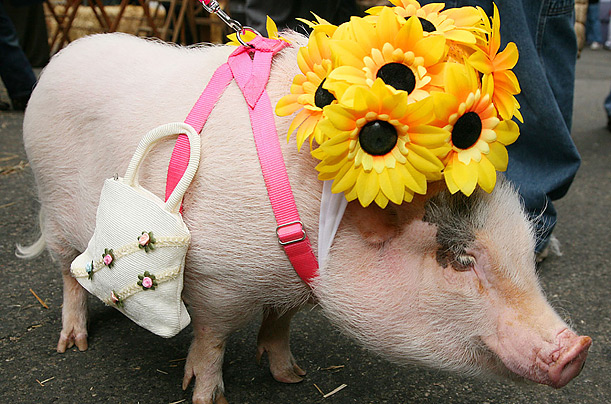 圖片六:在紐約城舉辦的第三十三屆麥茜畫展上,“豬小姐”頭戴鮮花,身背女士小坤包閃亮登場,吸引了眾多的目光。(鐘巖)