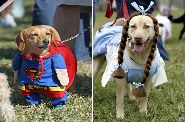 圖片十二:在美國加州長灘舉行的萬圣節服裝游行上,一種短腿長身的德國種獵犬芭比裝扮成超人的模樣;右圖中這個小狗的造型你熟悉么?它是來自新奧爾良的洛克西,它扮演的就是《綠野仙蹤》中的小女孩多羅茜。(鐘巖)