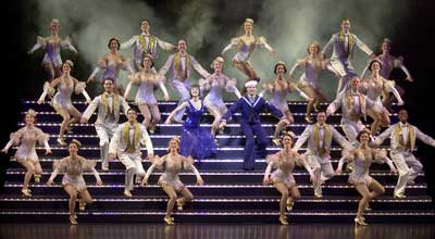“42街”是橫貫整個百老匯的一條大街,云集著幾十家劇院和上千名音樂劇演員。在那里,每天都上演著歌舞升平、星光燦爛的奢華景象。而在音樂劇《42街》中,將百老匯42街搬上劇場,以演員在街頭舞蹈的場面呈現百老匯的繁華與輝煌。燈火輝煌的百老匯42街,劇院林立,演員精神飽滿。20級的霓虹階梯上,54名年輕的演員們正在跳著歡快的踢踏舞,金光閃閃的服裝令人應接不暇。他們整齊而隨性的動作,咔咔作響的舞鞋,每一個聲音和每一個舞步都能讓人陶醉。這種純粹的、美式的、壯觀的踢踏舞群,完完全全把美國的繁華耀眼展示了出來。閃亮如星的布景、華麗炫目的服裝,盡顯的都是百老匯舞臺劇中的奢華主義。(張學軍)