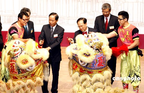 中國最高人民檢察院檢察長賈春旺(左)和行政長官曾蔭權出席開幕典禮,為醒獅點睛。