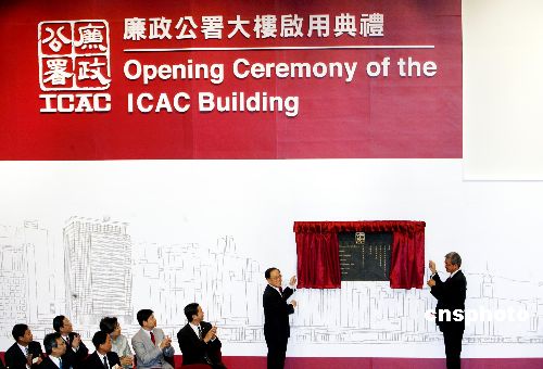 香港廉政公署新大樓十二月八日揭幕,中國最高人民檢察院檢察長賈春旺和行政長官曾蔭權出席開幕典禮。曾蔭權在開幕禮時表示,廉署成立30多年來,都致力維持本港重要核心價值,對貪污作出“零”容忍。他相信,廉署人員會繼續無畏和不偏不依,為香港服務。曾蔭權與廉署專員湯顯明主持揭幕禮。 中新社發 王麗南 攝