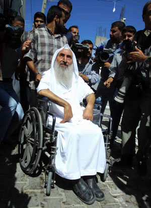 2005年6月,我見到亞辛,白衣老人坐在輪椅上,看起來十分瘦小,兩只手無力地垂在胸前。銀白的胡須、凌厲的鷹鉤鼻。他的聲帶顯然受損,聲音好像一把刀片刮在玻璃上,尖利卻不清楚。如果你距離他超過一米就根本聽不見他在說什么。藍(lán)灰色的眼珠看起來有些渾濁。有時(shí)他仰頭向上看,嘴唇微微張開,眼神呆滯;有時(shí)他的眼珠又異常靈活,發(fā)出冷冷的光。兩種表情在他臉上交替出現(xiàn)。8年的牢獄生活使亞辛的身體狀況進(jìn)一步惡化,視力、聽覺嚴(yán)重受損,完全癱瘓。