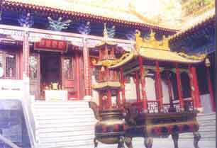 靈霄殿:殿內(nèi)中央供奉的是“玉皇大帝”,左為“天皇大帝”和“南極長(zhǎng)生大帝”,右為“紫微大帝”及“后土皇地祗”.兩側(cè)為年、月、日、時(shí)四值功曹.道經(jīng)上說(shuō):天有三十六層,三清居最上三層.玉帝居三十三天為萬(wàn)夫之主,主宰人間天上的禍福吉兇,及世界兵革、劫運(yùn),是民間信仰的最高神靈.左、右四位大帝,分別統(tǒng)帥萬(wàn)星、萬(wàn)雷、萬(wàn)靈、萬(wàn)地,以輔佐玉皇.傳說(shuō)四值功曹體察人間善惡功過(guò),時(shí)記月累,年滿上奏玉帝.臘月廿五玉帝下界巡世, 以人們所做的善惡或賜福或降惡。這天古代皇帝都要舉行盛大的祭天活動(dòng),以求國(guó)泰民安,天下太平.靈霄殿的兩壁畫(huà)的是“太乙救苦天尊”和“玄天上帝”帶領(lǐng)各自部下神將朝拜玉帝,奏事請(qǐng)旨的場(chǎng)面.畫(huà)中人物栩栩如生,神態(tài)端莊各異,體現(xiàn)了天界的莊嚴(yán)和諸神的無(wú)邊法力.當(dāng)年唐玄宗為感謝玉皇大帝的點(diǎn)化、護(hù)佑之恩,命人在這里修建了靈霄殿以及九曜星君殿和六丁六甲殿。