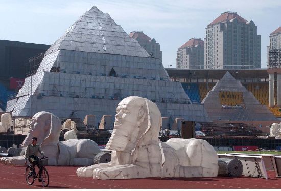 一座高達(dá)四十七米的金字塔模型曾出現(xiàn)在北京工人體育場。這里正在搭建世界超大型景觀歌劇《阿依達(dá)》的舞臺。該舞臺面積達(dá)六千多平方米。作為北京國際戲劇演出季的重頭劇目,《阿依達(dá)》上演。以后這種活動可能要繳費(fèi)。中新社發(fā) 張煒 攝