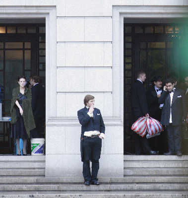 由于音樂廳四個門口都有劇組的工作人員嚴格控制進出人員,而導演陳凱歌,主演黎明、孫紅雷又都是經過地下停車場直接進入音樂廳內部,所以早報記者只是從工作人員處獲悉,當外籍演員都在兩側邊門抽煙聊天時,黎明正在音樂廳內上妝。據消息人士透露,為了昨日這場戲,黎明早在北京拍攝時就開始準備,而且為了符合梅蘭芳去百老匯時的體態(tài),黎明還特意增肥,使臉龐看起來圓潤一些,更貌似梅蘭芳。 記者 劉嘉琦
