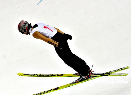 2008年1月23日上午,男子K90M個(gè)人跳臺(tái)滑雪開(kāi)始比賽,全國(guó)冬運(yùn)會(huì)第六天哈爾濱亞布力滑雪場(chǎng)下起了小雪,對(duì)此項(xiàng)比賽有所影響。通化市運(yùn)動(dòng)員田占東一跳奪冠,二三名分別被通化市另外兩位運(yùn)動(dòng)員李洋和王建勛獲得。中新社發(fā) 姚庭山 攝