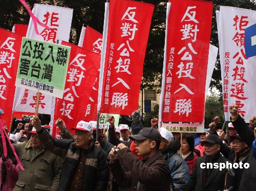 臺灣“中央選舉委員會”將從2月27日起主辦十場“入聯公投”、“返聯公投”意見發表會或辯論會,14日是反方代表申請期限。臺灣勞動黨主席吳榮元、民主行動聯盟總召集人黃光國到“中選會”遞交公投反方代表申請書,他們還率領“反公投入聯行動聯盟”成員在“中選會”前表達訴求,群眾高舉“反對公投入聯,拒領公投票”等標語,主張拒領公投票,要求中國國民黨與民主進步黨拋棄“公投入聯”、“公投返聯”議題。中新社發 耿軍 攝